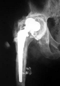 Это ведёт к децентрации головки эндопротеза (на представленной рентгенограмме видно смещение головки эндопротеза от центра) и нарушению функции конечности.